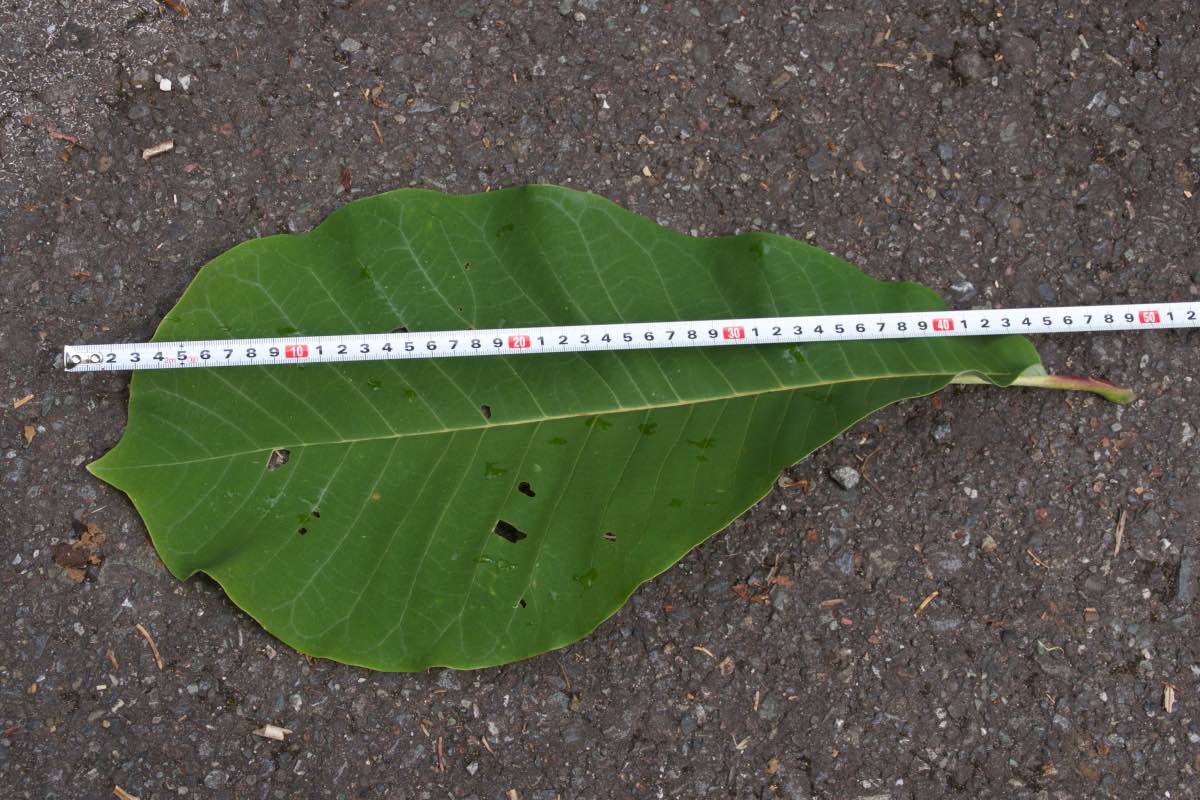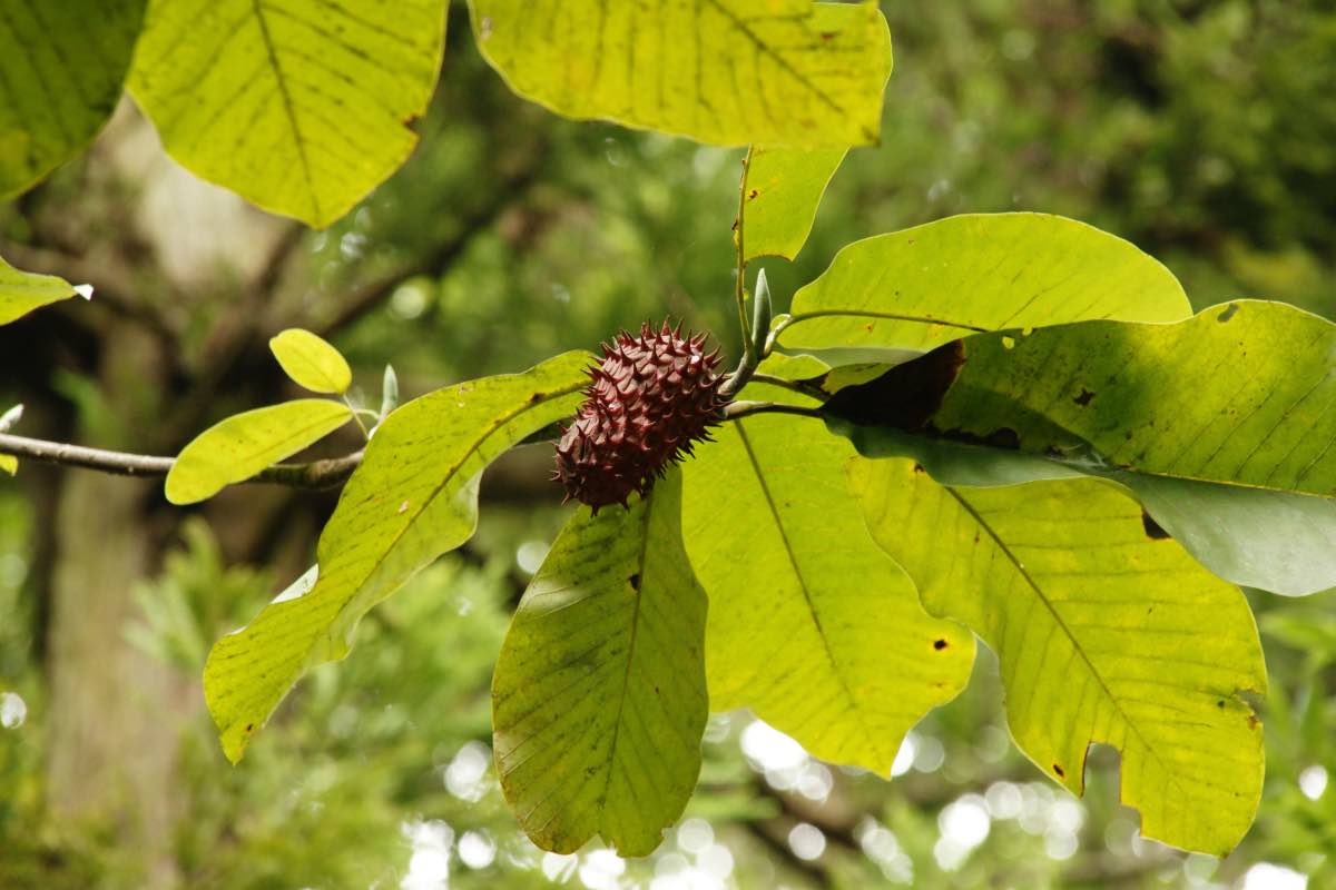 日本固有種で北海道(南千島を含む)から九州まで、日本海側から太平洋側まで山や里山に広く生えています。ホオノキは成長が速く、高さは20m以上、太さは1m以上にもなります。中には30mにもなる大木もあります。ホオノキの特徴は、その葉の大きさです。卵の形に似ていて長さが30~40cmと、人の顔が隠れてしまうぐらい大きい葉です。葉が展開した後の5~6月に咲く黄白色で芳香のある花も20cm近くになるぐらい大きくなります。樹皮は灰白色で平滑ですが、イボ状の丸い皮目が目立ちます。果実は長楕円形の集合果で、9〜11月に赤く熟します。[1][2][3][4]