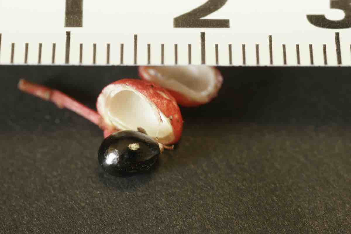 9〜10月には赤褐色に果実が熟し、裂開して光沢のある黒い種子が出てきます。