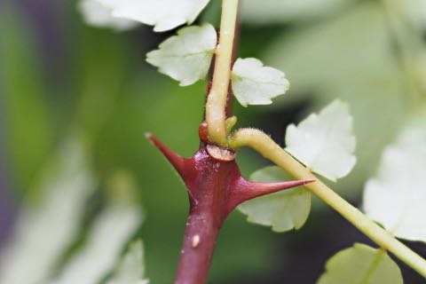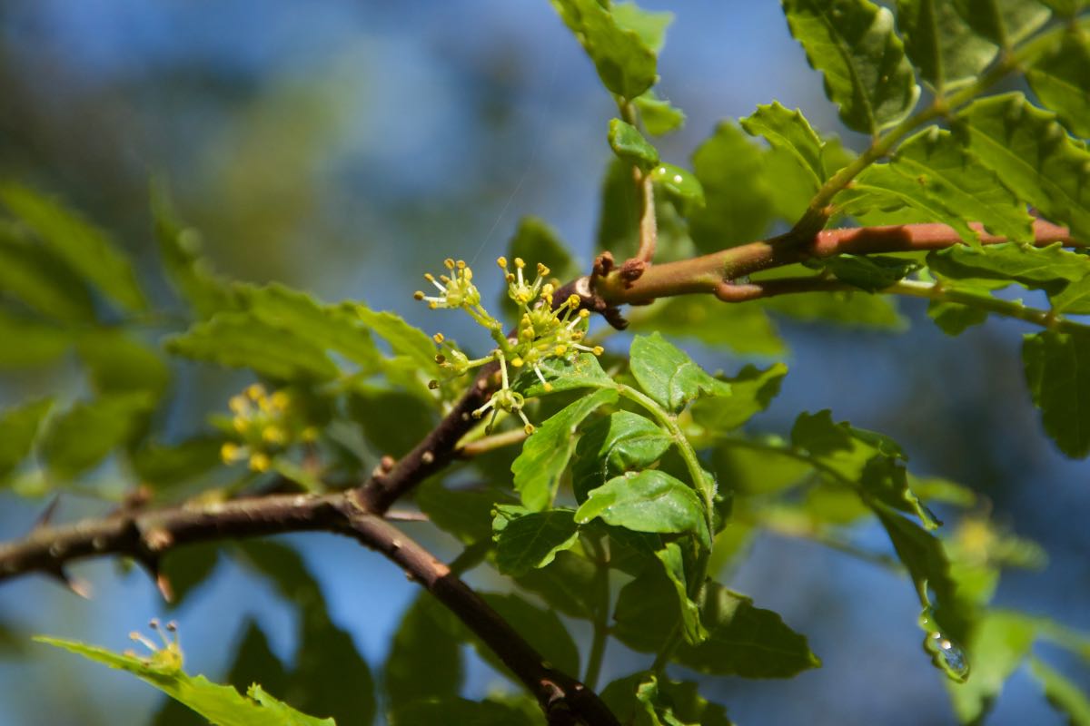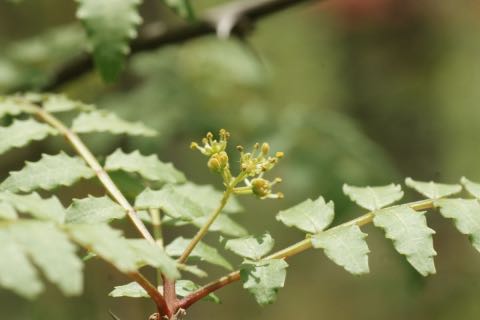 枝には棘が対生してつきます。よく似た同属のイヌザンショウは棘が互生します。