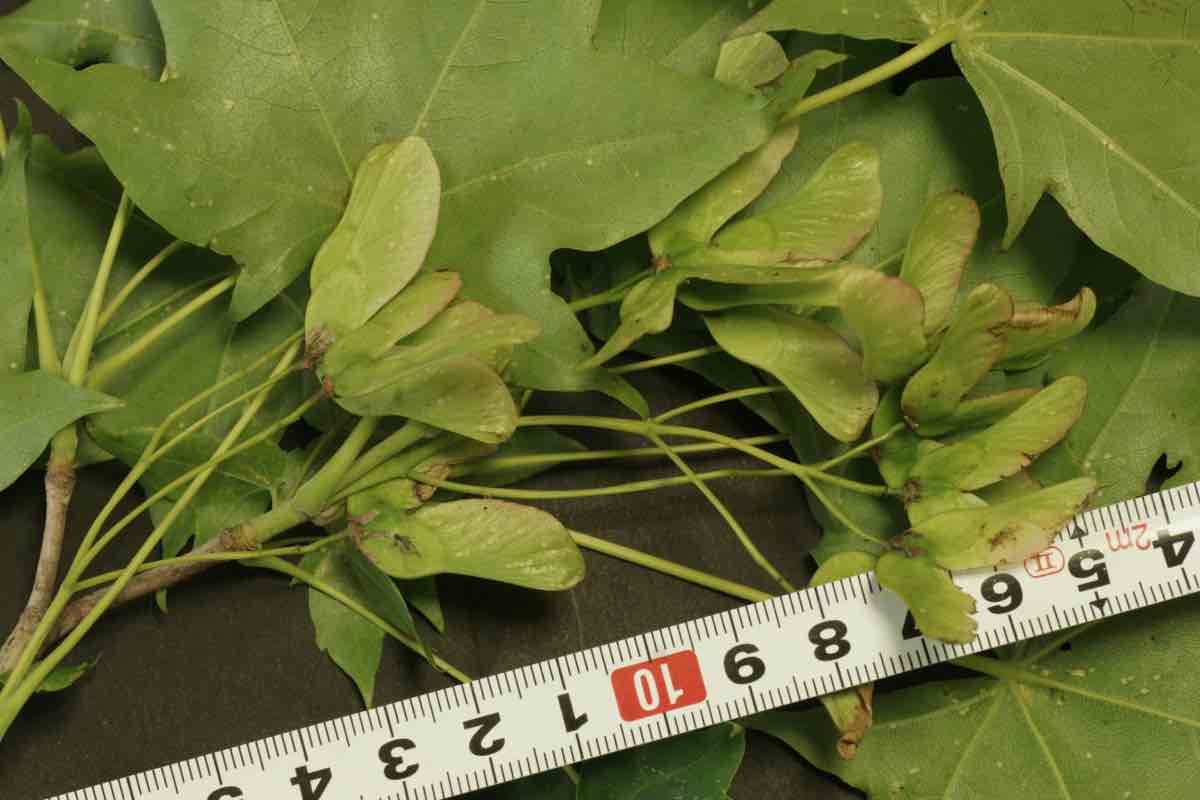 北海道の全域、東北から北陸の日本海沿海と青森、岩手、宮城の太平洋側、また遠く島根県の隠岐島に分布しています。樹高は10〜20mほどになり、樹皮は灰色で縦に深くひび割れます。葉は手のひら状に浅く5〜9裂しますが、中でも7裂が多いようです。その葉はイタヤカエデ類の中で最も均整がとれているように思えます。5月に黄色い花を枝先に咲かせますが、花は小さく葉の展開と同じなので離れて見ると目立ちません。同じ花序に雄しべの退化した両性花と、雄花の両方が付きます。果実は翼果ですが、無毛の翼がへの字に垂れ下がります。[1][2][3]