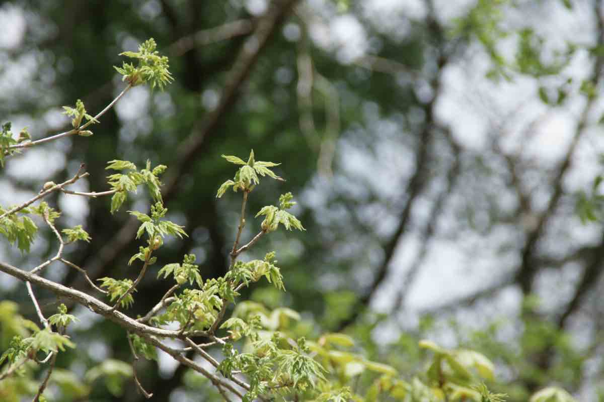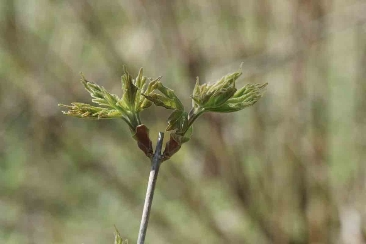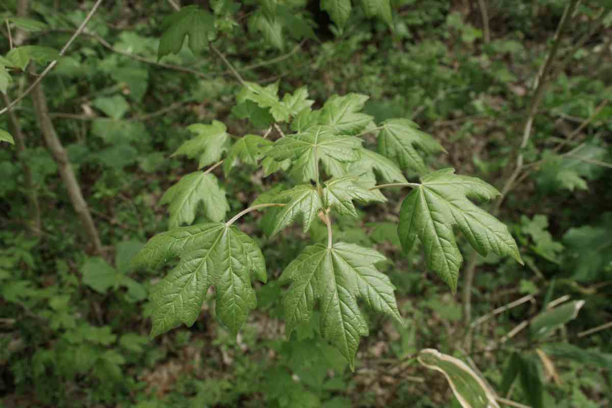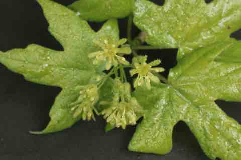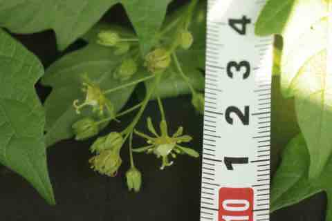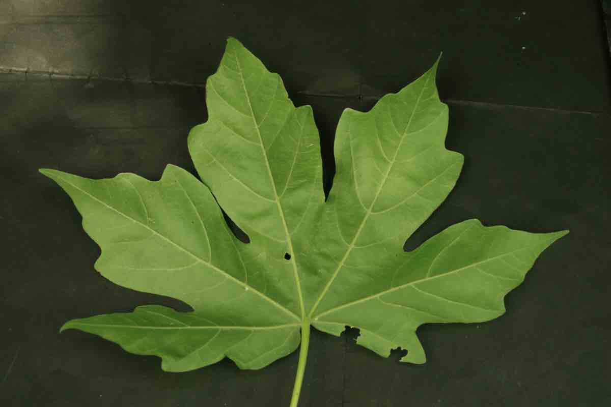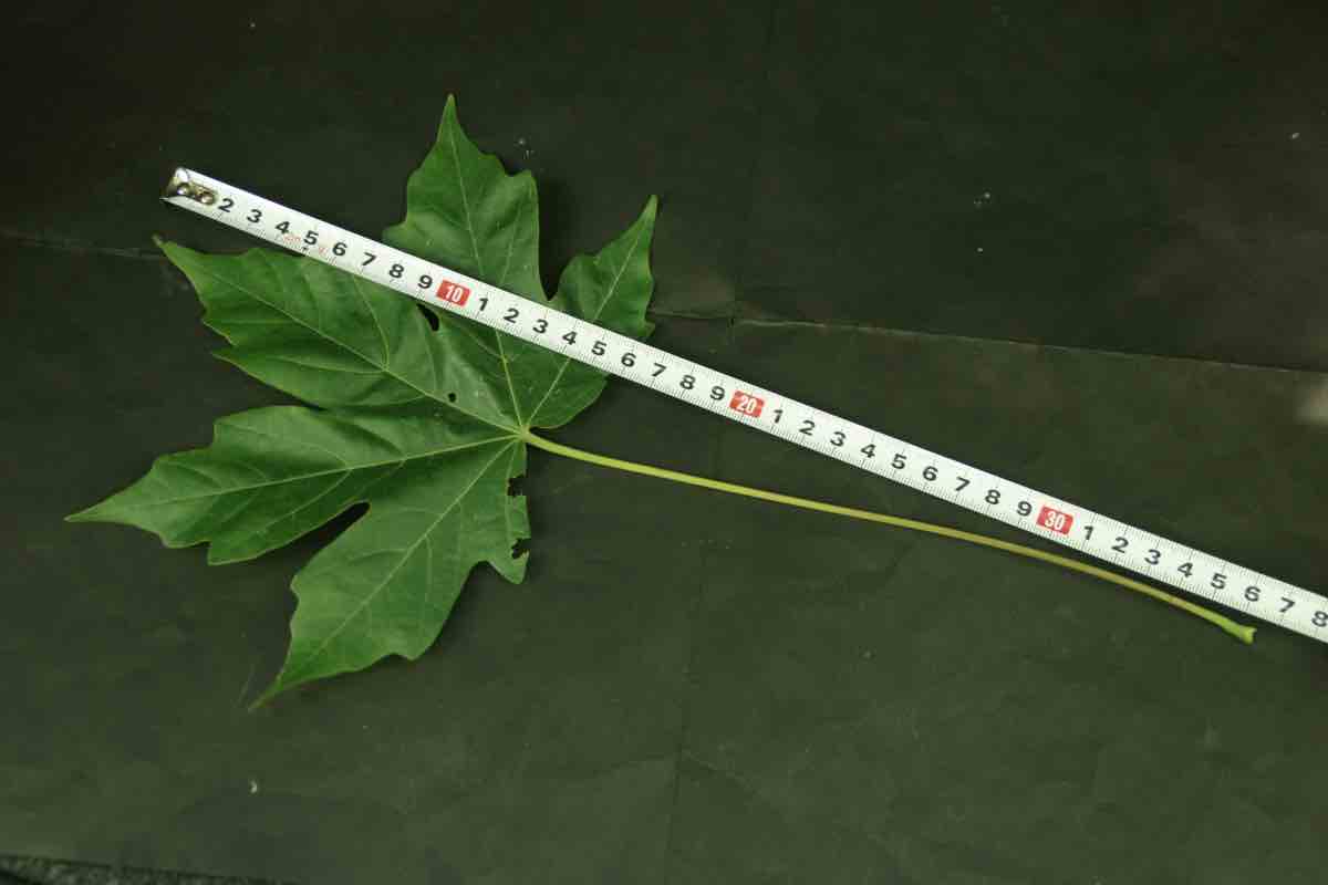 葉は手のひらのように五裂し、先端の鈍い鋸歯があります。