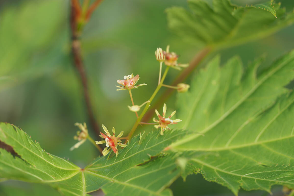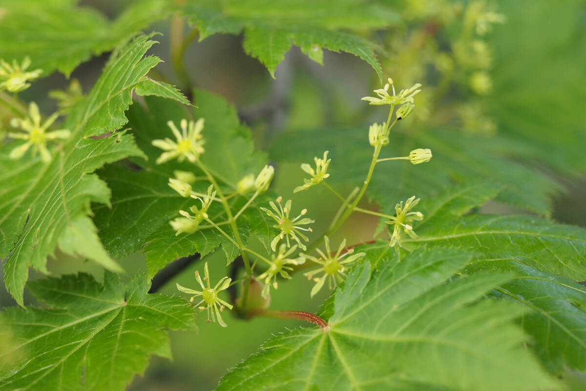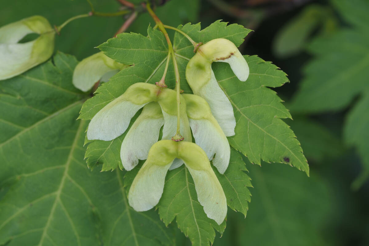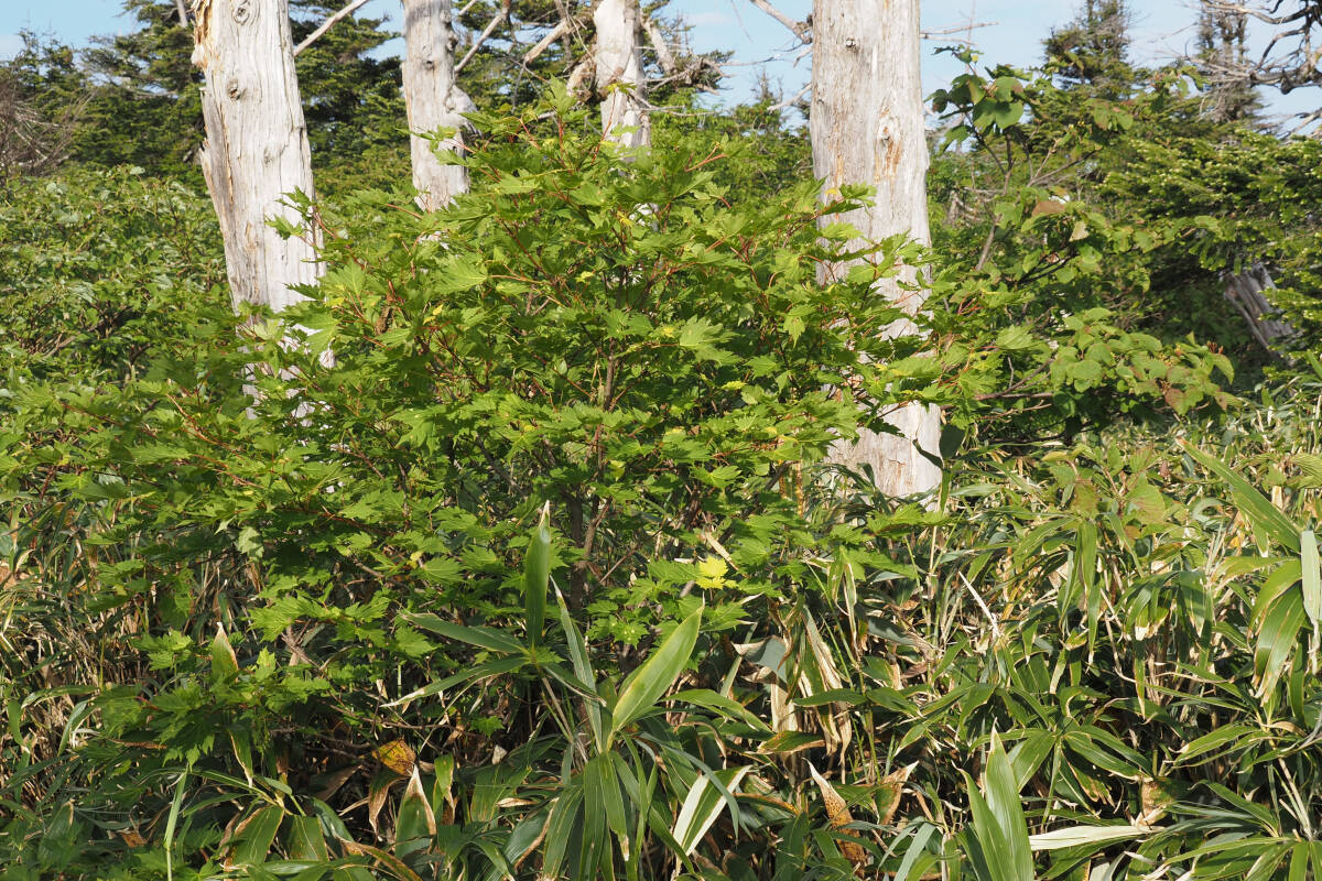 北海道から本州中部地方までの亜高山帯に自生している日本固有種です。株立し高いものだと樹高は8〜10mほどになります。樹皮は灰褐色で縦に浅い筋が入ります。葉身が5〜9cmの葉は5裂または希に7裂する掌状中裂で、それぞれの裂片は浅い切れ込みがあり重鋸歯です。葉裏の脈腋には褐色の軟毛が生えています。6〜7月に咲く淡黄色または薄緑色の花は、径が9mm前後で総状花序に多いもので10個ほど付きます。雄花を付ける個体と雌花をつける個体が分かれる雌雄異株ですが、雄花と雌花の両方を咲かせる個体もあり、このような個体群の性型を雄性雌性両性異種とも呼びます。翼果である果実は10月に熟し、鋭角から直角に開きます。[1][2][3][4]