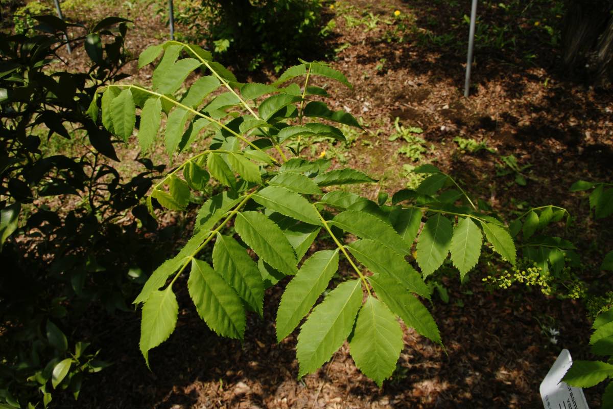 日本各地の山地の林内に点々と自生しています。樹高は10〜15mほどになり、樹皮は暗褐色から黒褐色で滑らかです。葉は羽状複葉です。小葉の長さは4〜8cmの長楕円形で、先端が尖っており、左右不相称です。4〜5月に黄緑色の小さい花を多数咲かせます。9月には緑黒色に熟します。[1][2][3]
