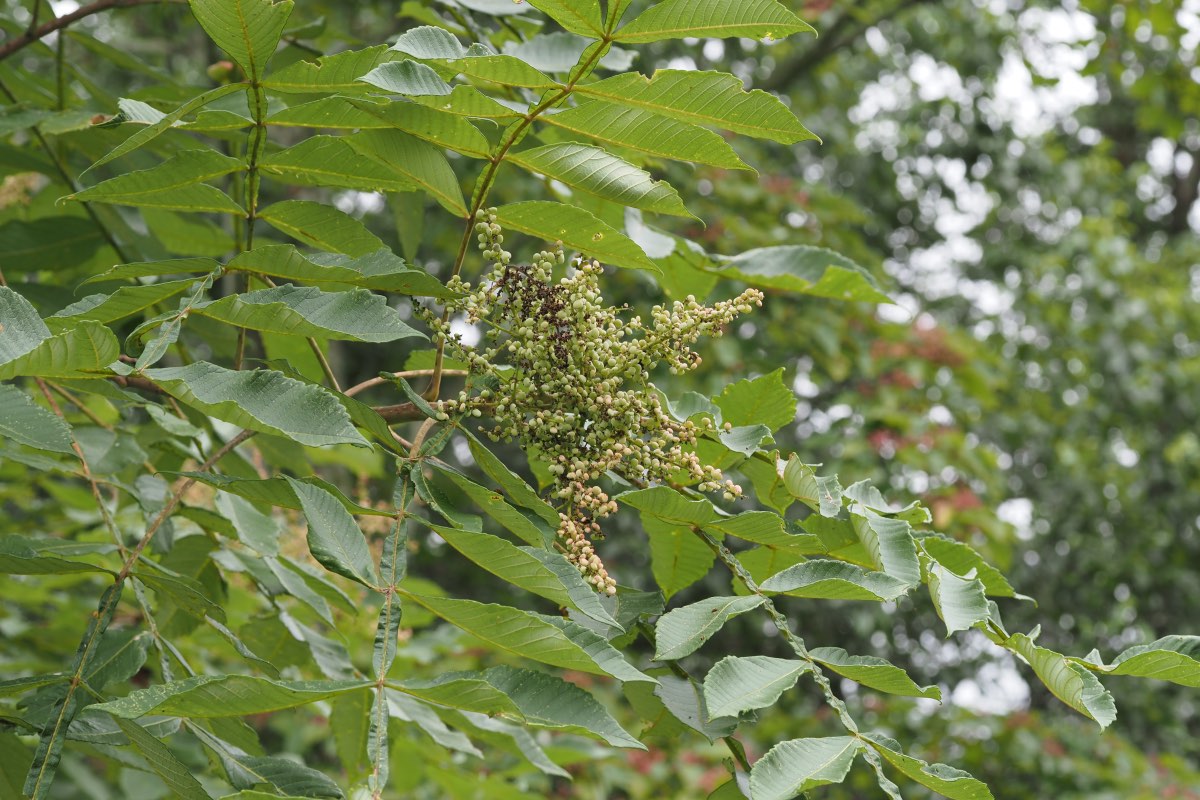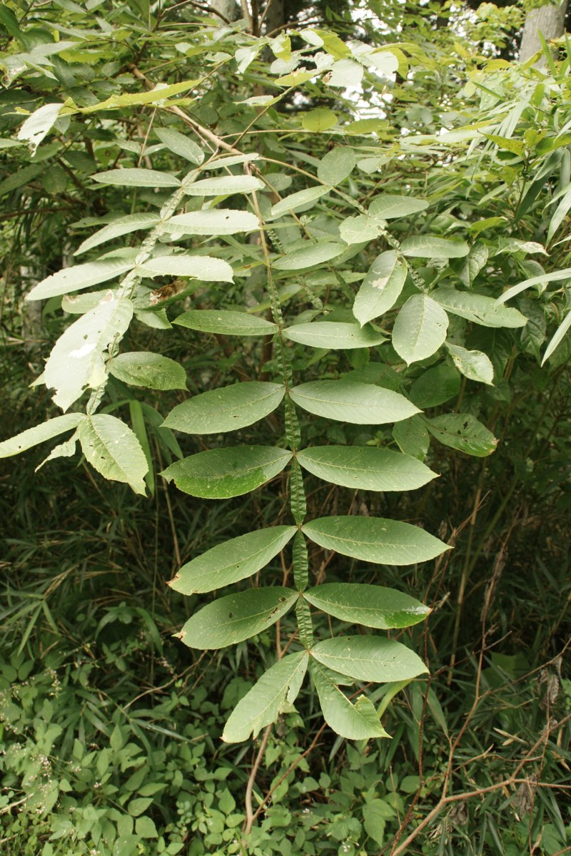 低山から低地の河原や林縁といった明るい場所に生え、高いものだと10mほどになる小高木です。奇数羽状複葉は長さが30〜70cmと長く、明瞭な重鋸歯が目立つ3〜6対の小葉は長さ5〜15cmで裏には軟毛が密生しています。小葉に重鋸歯があるのと葉軸に翼があるのが特徴的で、その姿が似ているウルシ属のヤマウルシやハゼノキなどとも区別が容易です。8〜9月に小さな白い花を多数咲かせます。10〜11月には果実が黄赤色に熟し、白い物質を分泌します。樹皮は褐灰色で皮目が目立ちます。[1][2]