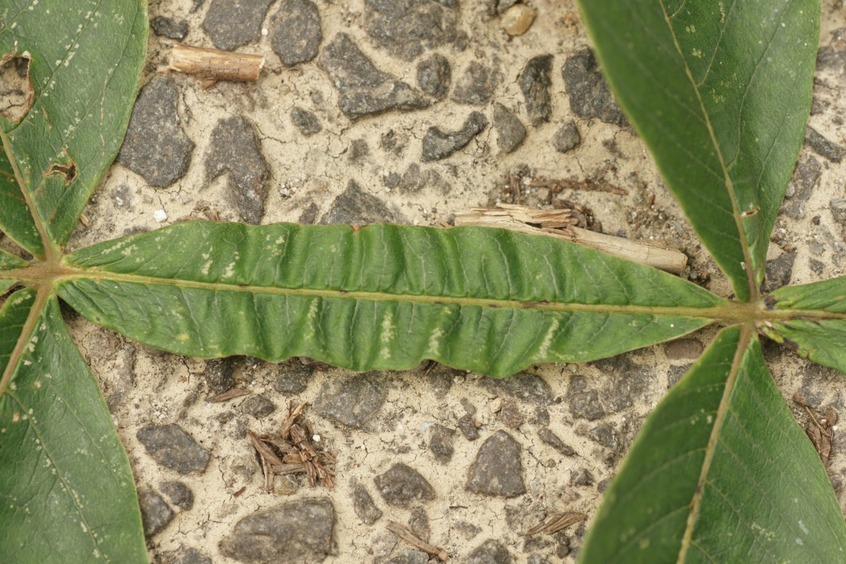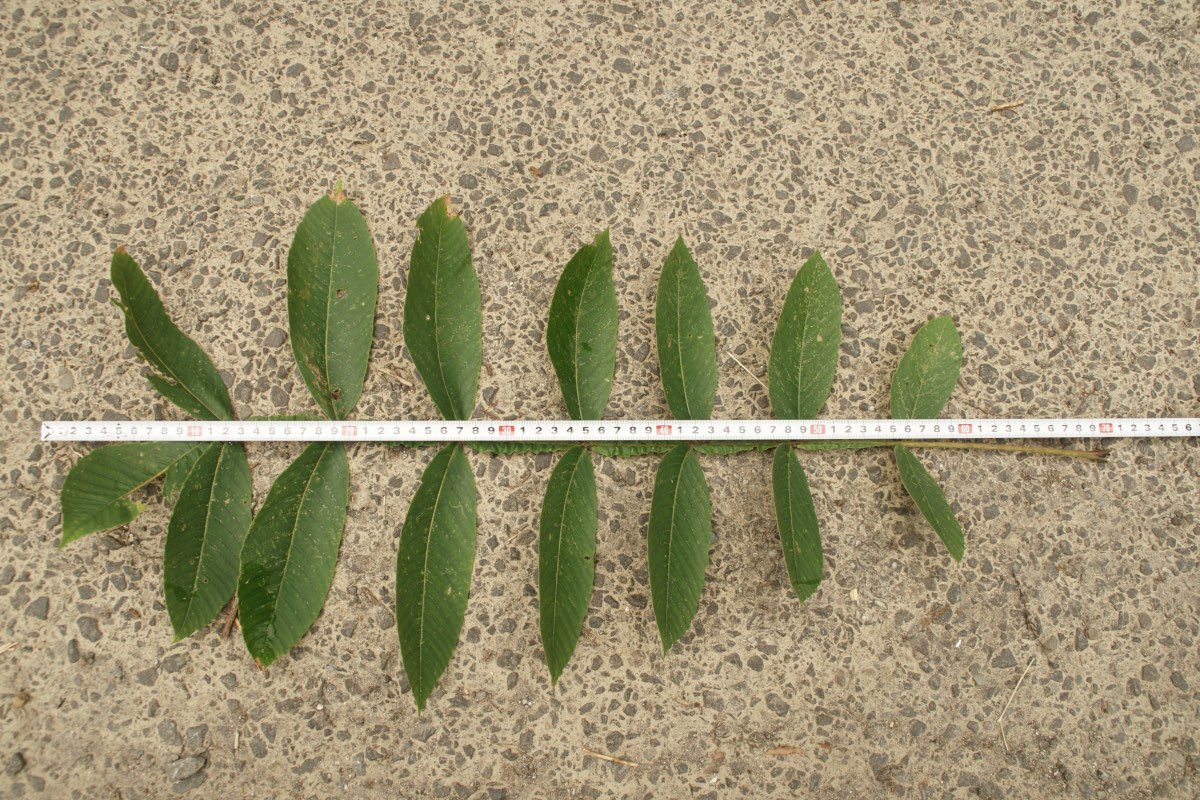 奇数羽状複葉は長さが30〜70cmと長く、明瞭な重鋸歯が目立つ3〜6対の小葉は長さ5〜15cmで裏には軟毛が密生しています。