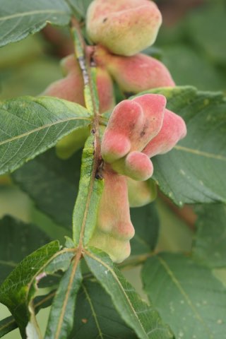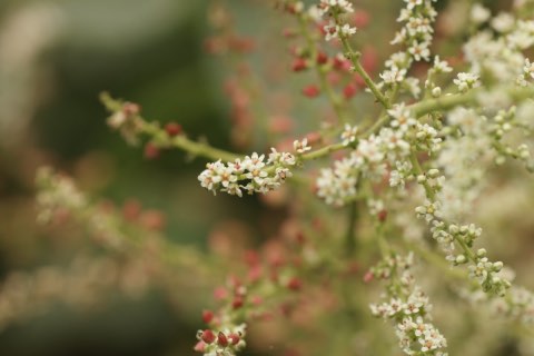 果実は熟すと白い結晶で覆われます。この白い物質はリンゴ酸カルシウムで、酸っぱ塩辛い味で、昔は塩の代用にしていたこともあったとか。果実そのものも下痢や咳の薬として、先の五倍子は止血薬として用いられ、また小正月の行事として行われていた、豊作祈願や魔除けに用いられる農具の模型や木の棒を削った人形の材料にヌルデがよく使われていました。このようにヌルデは民俗に深い関わりがある樹木です。なお、ウルシ属はヌルデと同じ「Rhus」とされていましたが、分子系統学によってヌルデ属から独立し「Toxicodendron」となりました。[9]