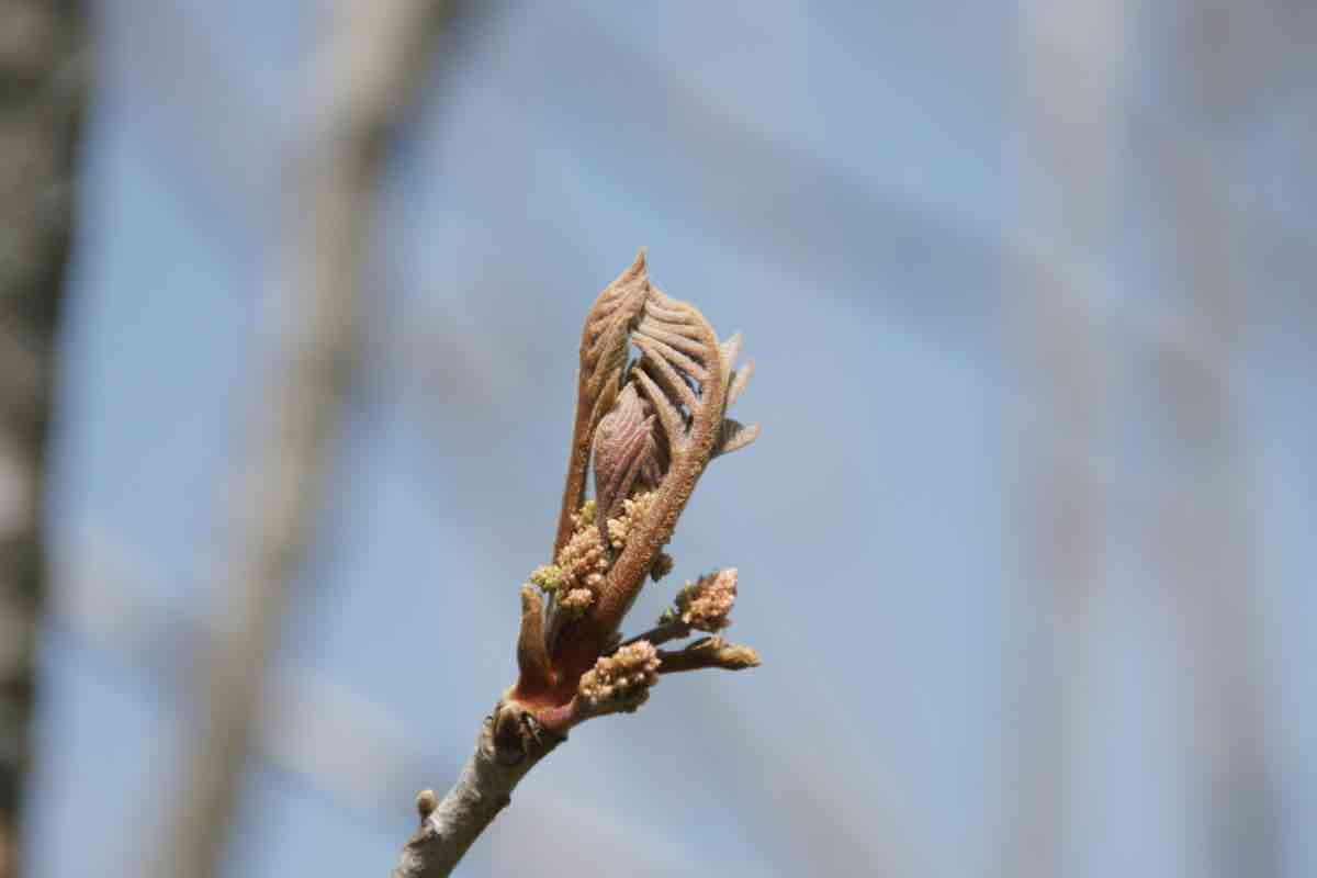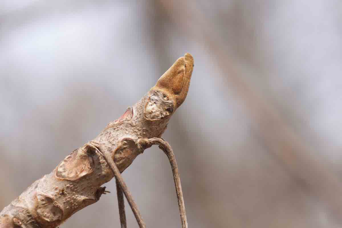 褐色の毛に覆われている冬芽は冬芽を保護する鱗芽を持たない裸芽で、その近くには大きな三角形かハート形の葉痕を見ることができます。