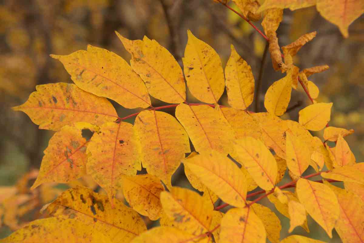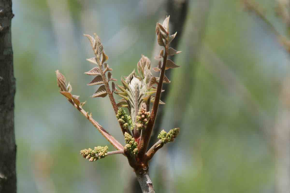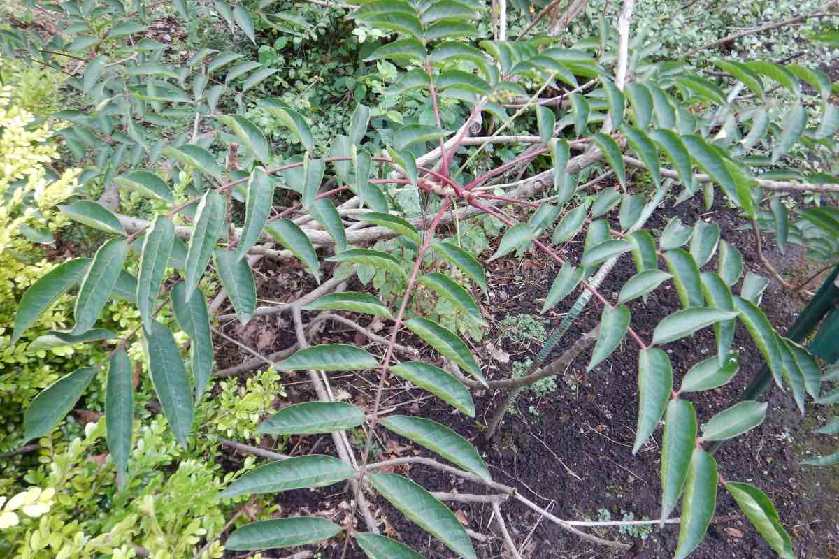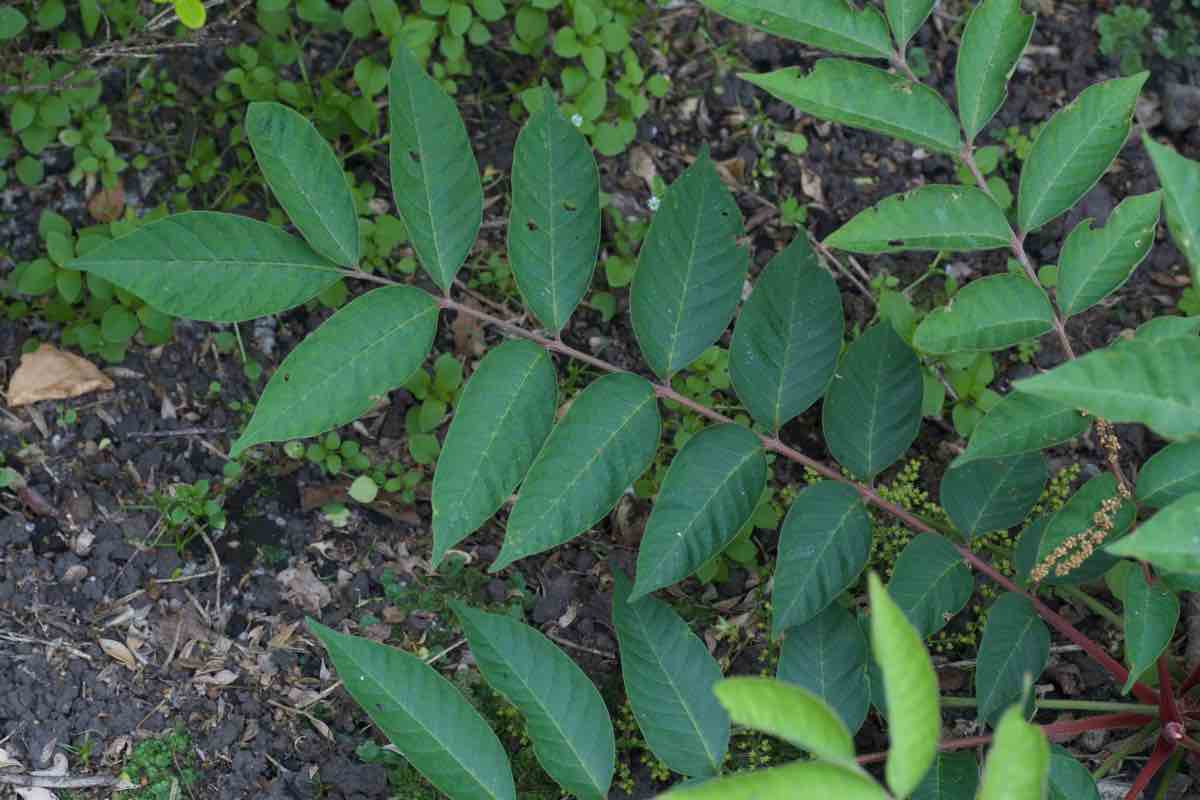 葉は奇数羽状複葉で、赤みを帯びた葉軸に小葉が4〜8対あります。