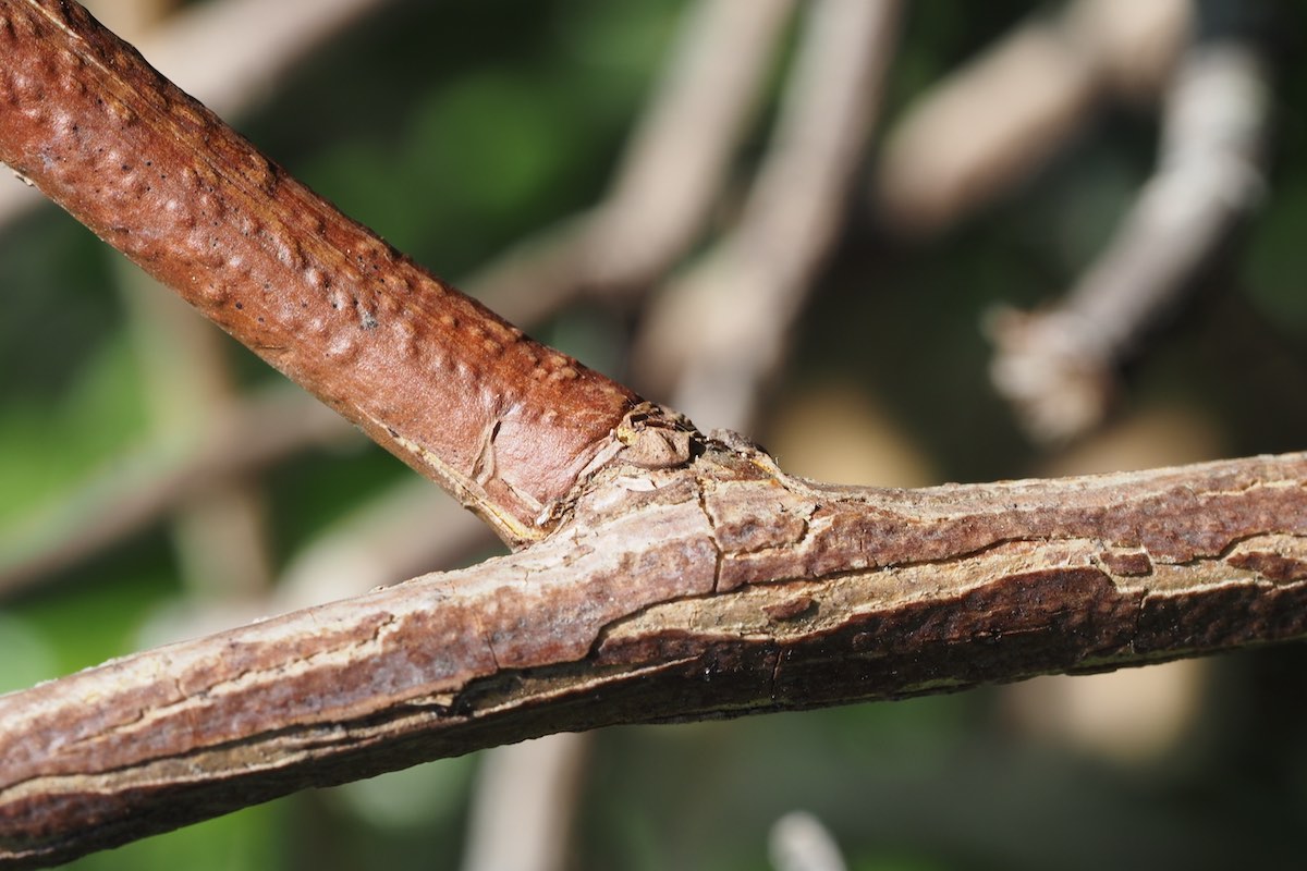 木質化した若い枝の樹皮は赤褐色ですが、年を経ると灰褐色〜灰色になって縦に裂けます。