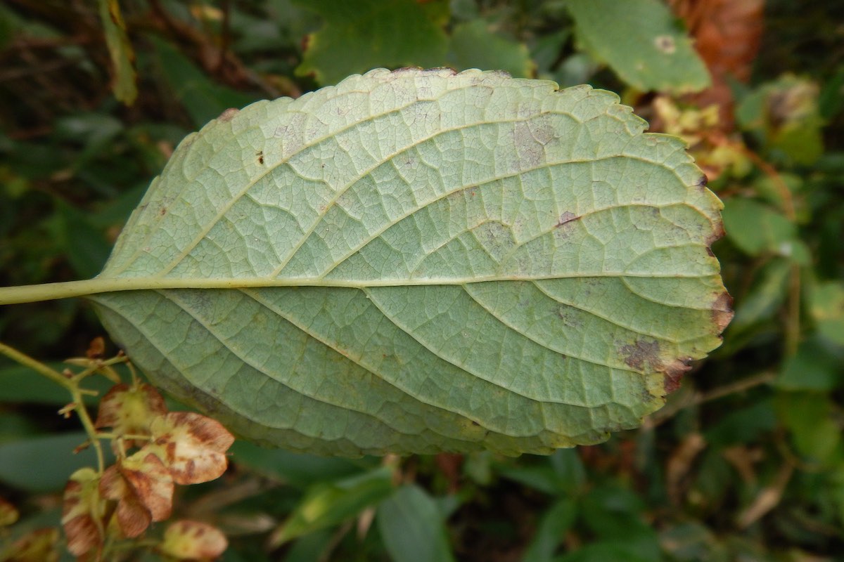 葉は葉身が5〜15cmの楕円形か卵形で、葉先は突き出ていて、葉縁全体に鈍い鋸歯があります。