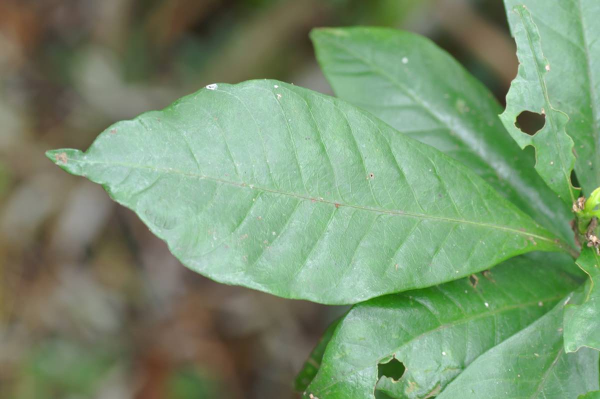静岡県から西側、四国、九州、沖縄の林縁に生えています。樹高は1〜2mほどになり、庭木として植えられていることも多いです。樹皮は灰褐色です。葉は楕円形で、葉先も葉柄側も細く尖っています。6〜7月、直径5〜6cmの白い花を枝先に咲かせます。甘い花の香りは濃厚です。合弁花ですが、先端が分裂しているため離弁花のようにも見えます。分裂は5〜7ですが、その多くは6裂です。雌しべは中央に1本、雄しべは花弁が分裂している隙間に入ることが多いようです。実は長さ2〜3cmの楕円形で、萼片が実の先端に残ります。11〜12月にオレンジ色に熟します。[1][2]