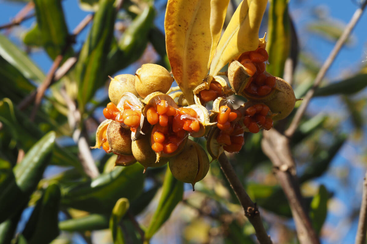 直径1.5cm程度の果実が11〜12月に灰褐色に熟して割れ、表面が粘つく赤い種子が顔を出します。