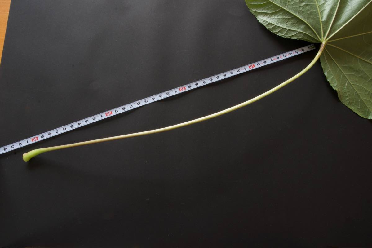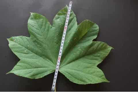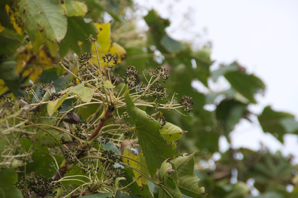 葉は枝先に集まり、その葉身は10〜30cmと非常に大きく、先端が5〜9に分裂します。葉柄も長く10〜30cmになります。7〜8月、枝先に目立たない小さな花を多数咲かせます。直径3〜5mmの球形の果実が10月頃に黒く熟し、落葉した後も年を越します。ただし豊凶に差があって、長いと3〜4年の間隔で豊作の年が訪れることもあります。
