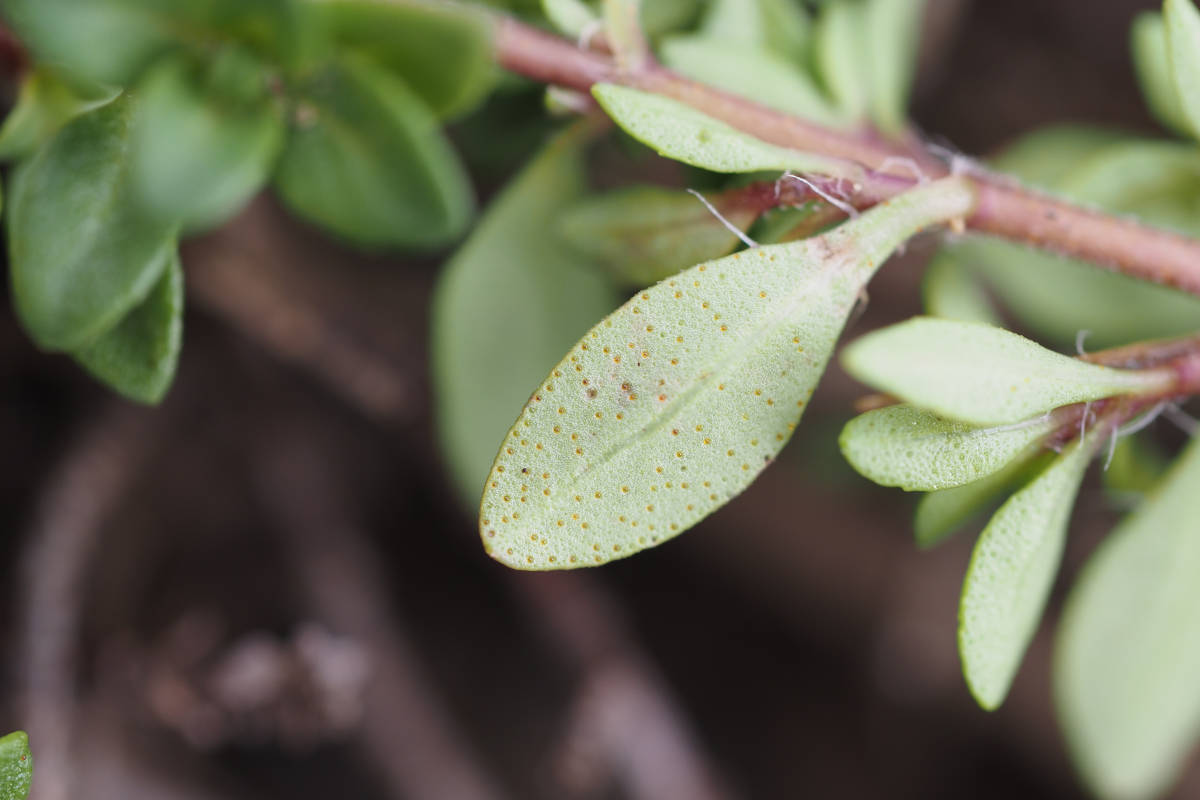 十字対生する狭卵形の葉は葉身が5〜10mmあって全縁です。