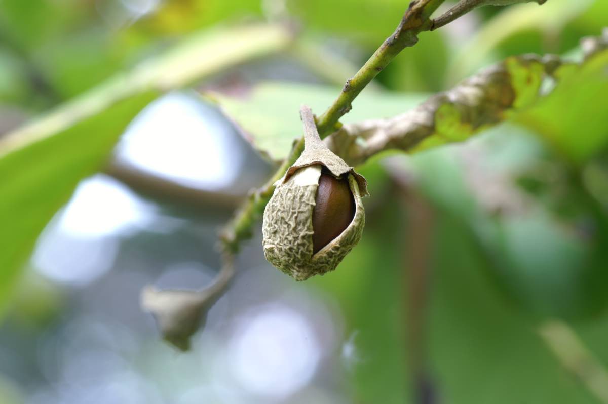 実は直径15mm程度の球形で、9月頃に熟し果皮が割れて中から種子が1つ出てきます。