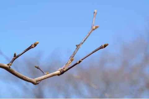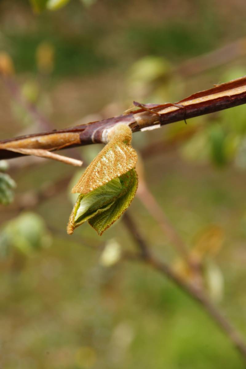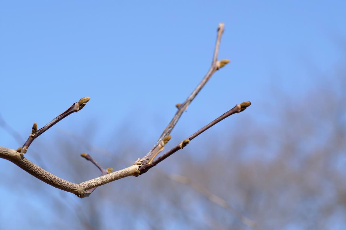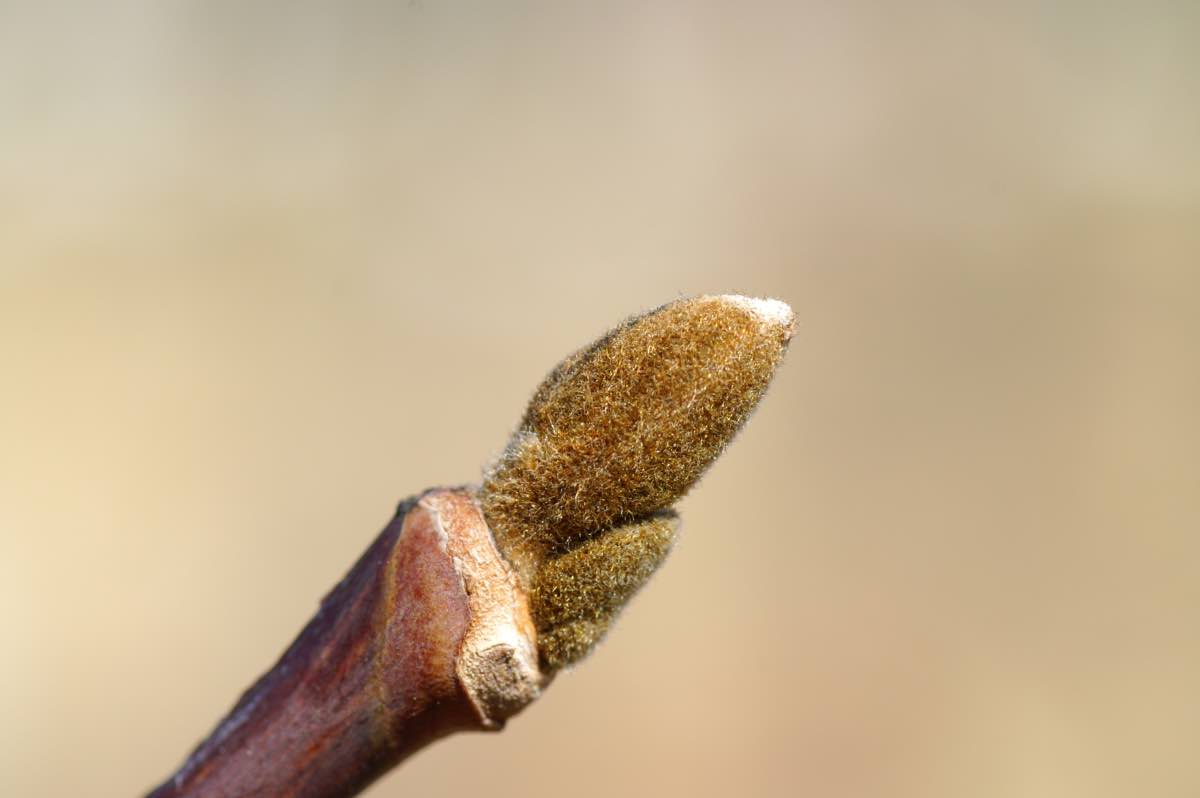 冬芽は楕円形で柔らかい金色の毛に包まれています。