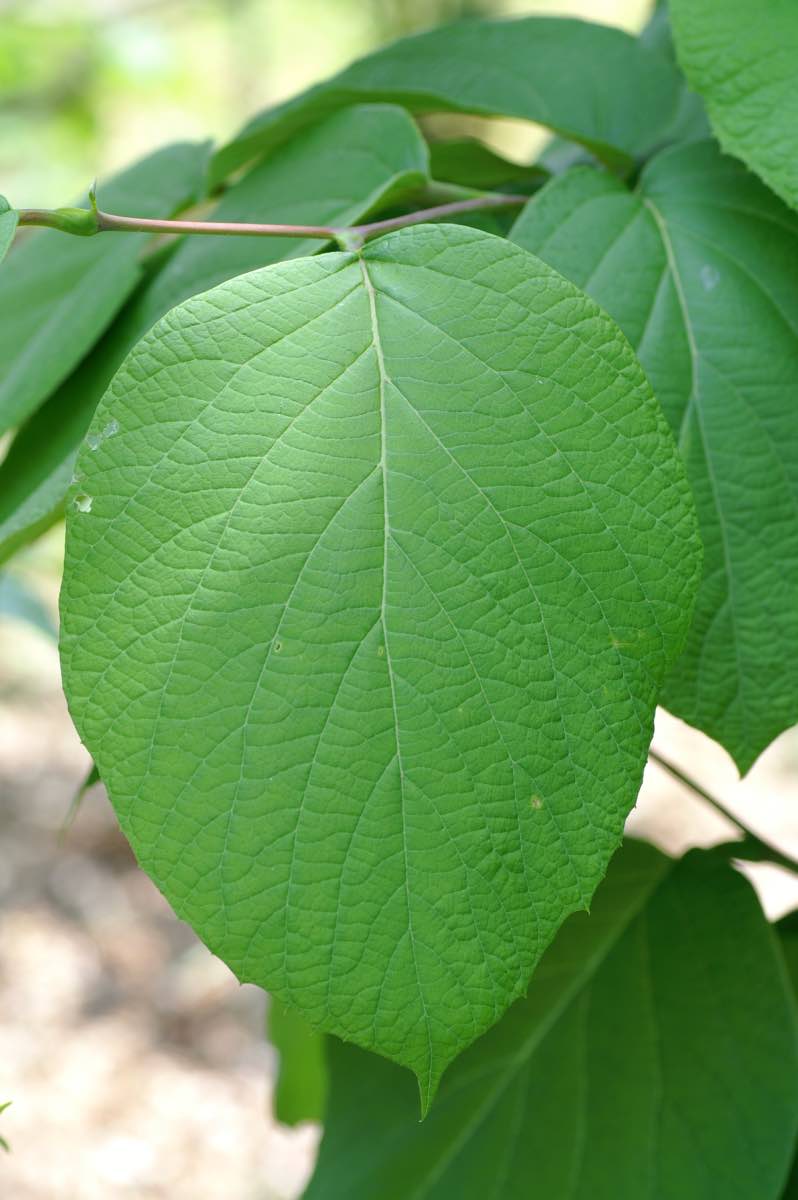 高さは6〜15mで、北海道から九州まで、山地の落葉樹林内によく生えています。冬芽は楕円形で柔らかい金色の毛に包まれています。葉は円形状で長さ20cmほどになります。先半分に鋸歯があり、先端は突き出ています。5〜6月に白い花が1つの花序に20個ほど付いて咲きます。実は直径15mm程度の球形で、9月頃に熟し果皮が割れて中から種子が1つ出てきます。樹皮は黒褐色、滑らかで縦に筋が入りますが大きく裂けるほどにはなりません。[1][2]。