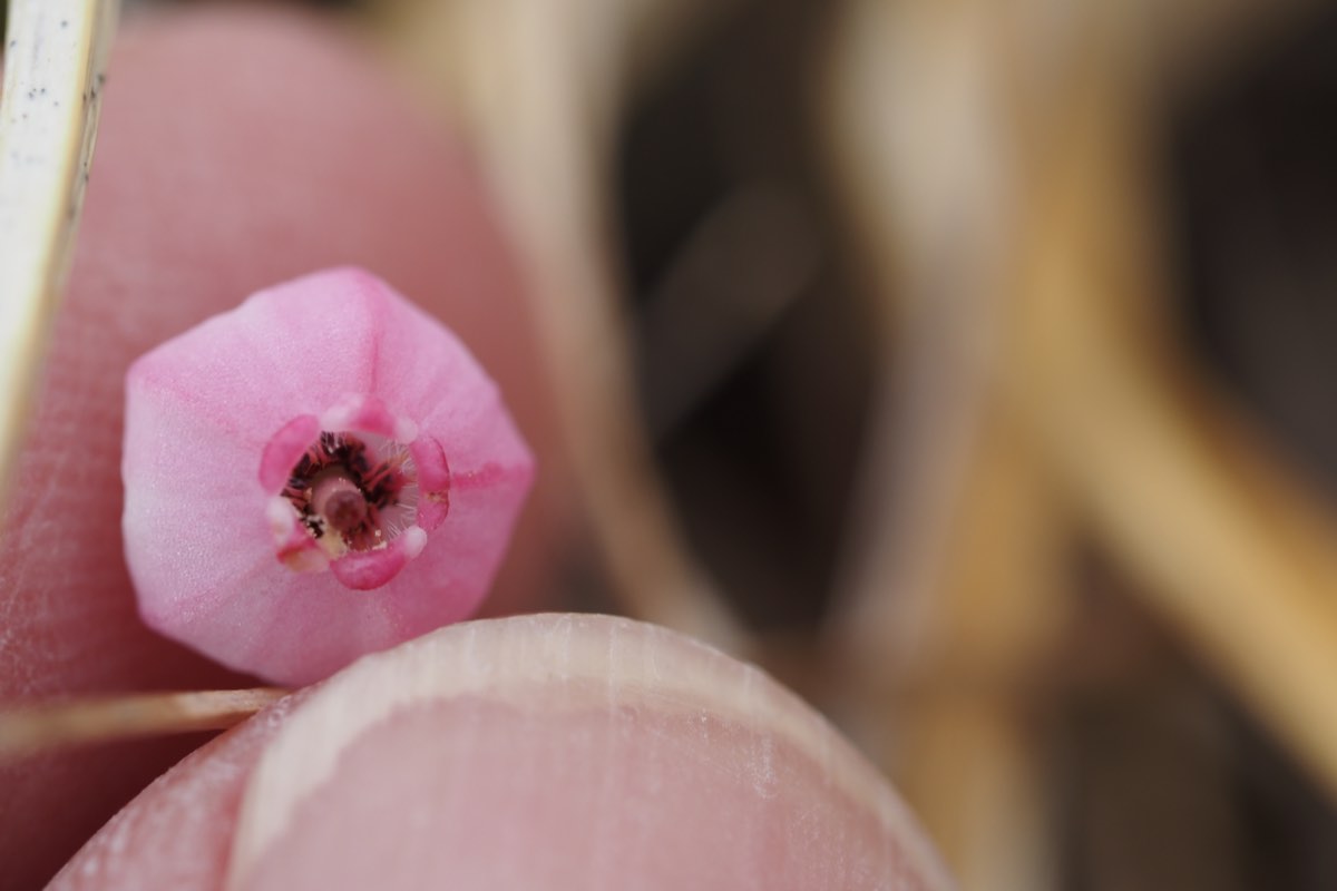 6〜7月ごろ下向きに咲くピンク色で壺状の花は先が5つに浅く裂けて外側に反っています。