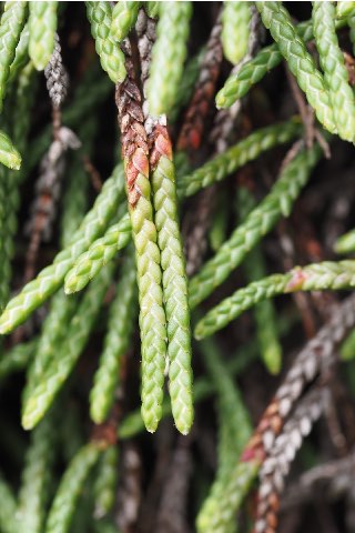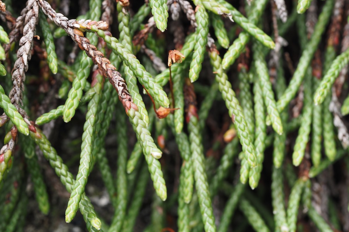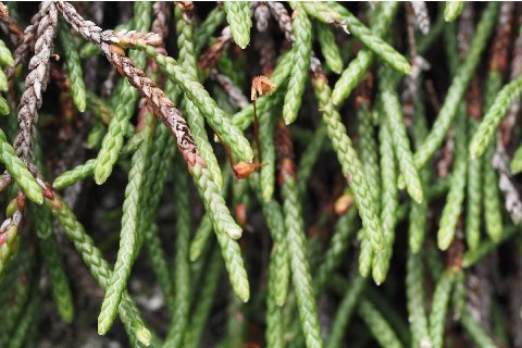 緑色の茎だけが広がっているように見えますが、これは十字対生した鱗状の葉が細い茎の周りにびっしりと付いているためです。
