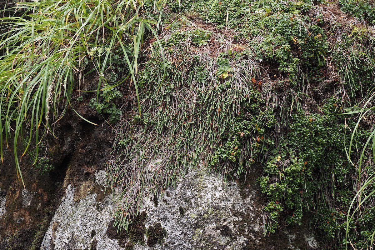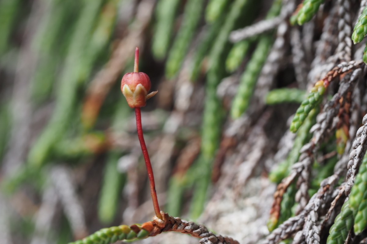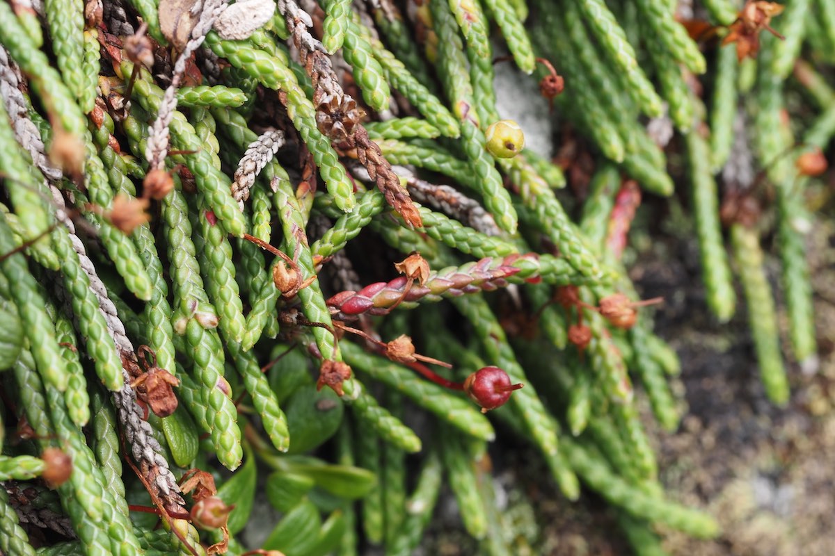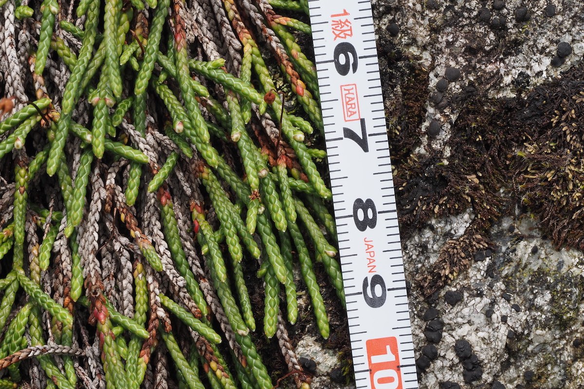 高山植物に見られる特徴は耐寒性や耐風性の強さです。イワヒゲの茎を覆っている鱗状の葉の表には気孔がなく、厚いクチクラ層が覆っています。外から見えない内側にしか気孔がありません。そのため気孔から蒸散する水は外気に晒されず、強い風によって急激に水が失われるのを防いでいます。また地上部はー30〜ー40℃まで耐えられたそうです。[4][5]