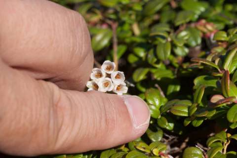 北海道、本州、四国、九州の高山帯や亜高山帯に自生しています。北海道では千mクラスの山から、霧が多いため年間を通して気温の低い道東の湿原などの低地でも見ることができます。樹高は高くて20cm程度、匍匐して横に広がります。葉は楕円形で光沢があり、裏側に向かって若干丸まります。6〜7月に釣り鐘状の白か薄いピンク色の花を咲かせ、8〜9月に球形の赤い果実を実らせます。[1][2]