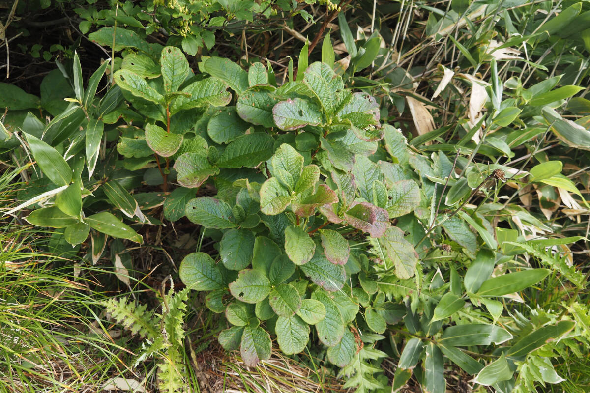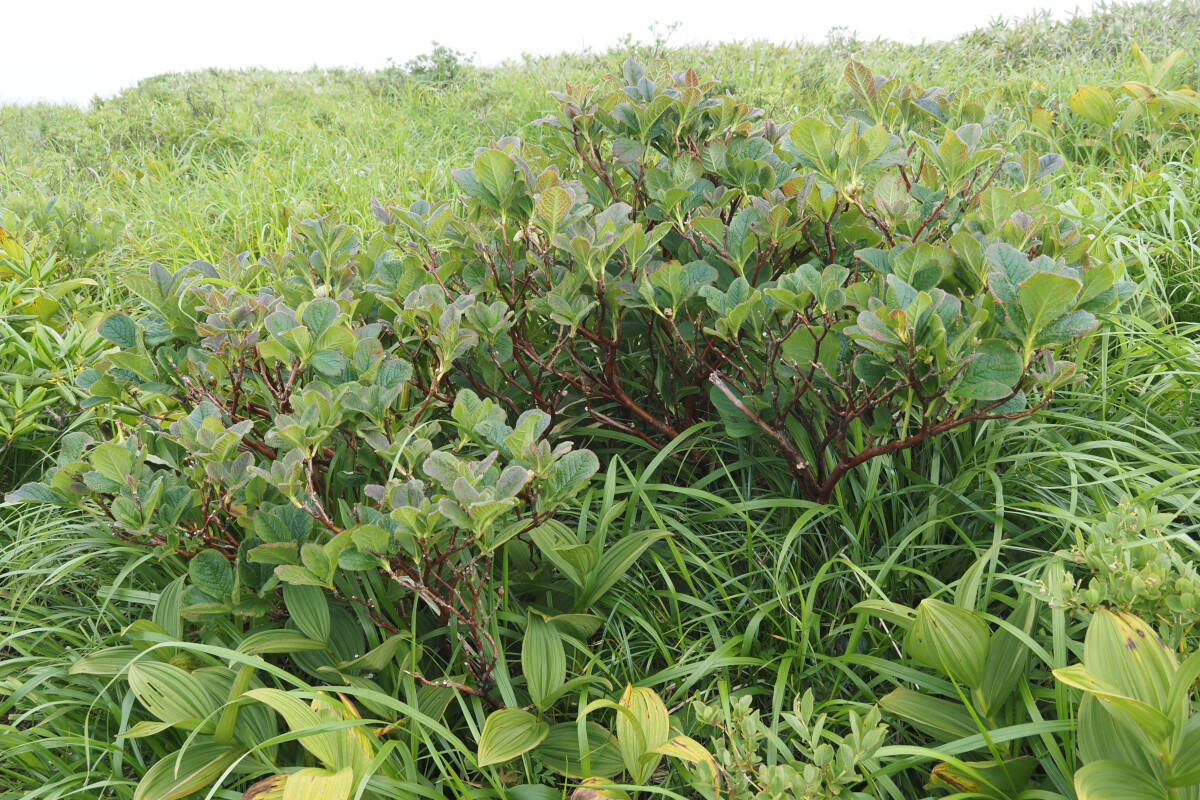 オオバツツジは、日本海側の多雪地帯に自生しており、分布の中心が日本海側にある植物を意味する日本海要素の1つと言われています。東北地方から北陸地方にかけて広範囲に分布しているものの、群生しているのではなくぽつぽつと個体があるという風で、標高の高い位置に自生していることもあり、あまり見かける機会の少ない種です。ここにある写真は、秋田駒ヶ岳で標高1100m前後、那須連峰の大倉山は標高約1800m、至仏山では標高1700m前後に自生していた個体です。富山県では標高1400〜2200mの範囲で確認されているとのこと。RNAを合成する酵素の1つであるRNAポリメラーゼⅡを構成する2番目に大きなサブセットRPB2遺伝子を分析することにより、世界に分布するツツジ属87種の分子系統解析を行った研究などがあります。それらによればオオバツツジは、かなり古い時代に分岐し遺伝的に大きく離れて子孫を残してきたものの、絶滅の途にある遺存種と見られるそうです。個体数の少なさにも納得がいきます。[6][7][8]