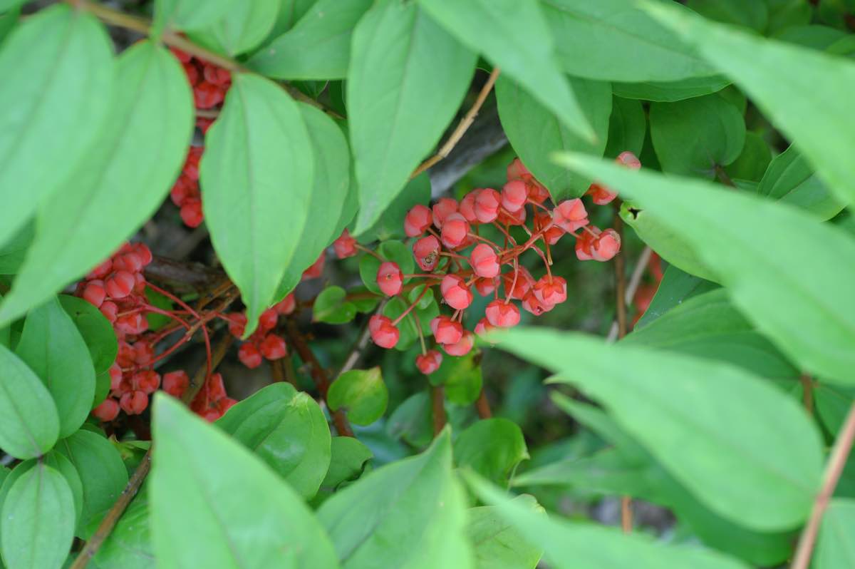 ドクウツギの特色は、トリカブト、ドクゼリと並ぶ日本三大有毒植物の1つに挙げられるその毒です。ドクウツギ全体に、いずれも神経毒であるコリアミルチン、ツチン、コリアリンを含んでいます。誤食すると目まいや頭痛、重症になると全身麻痺、昏睡し死に至ります。特に果実は毒性が強いのですが、それを包んでいる熟した偽果(肥大化した花弁の部分)には甘みがあります。戦前は、年間300件あった植物による中毒死のうち、ドクウツギによるものが10%あったそうです。見た目もおいしそうで事実甘いため、これを食べた子どもが死に至った事故が多かったのも納得できます。名の由来はその名の通り毒から付けたようで、別名でイチロベゴロシとも呼ばれるように方言名にもその毒性に由来するものが多いです。[4][5]