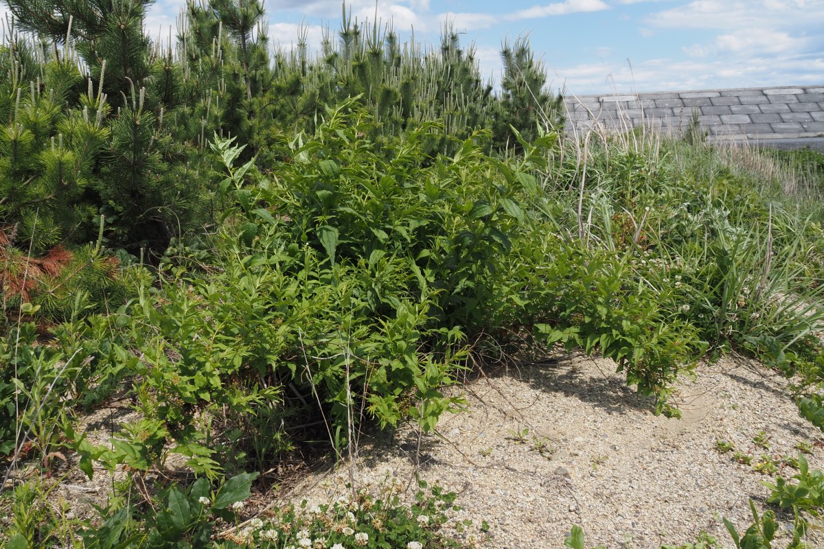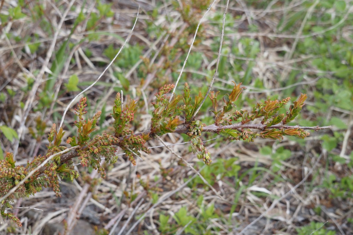 日本の固有種で本州の近畿地方から北、北海道日本海側の河川敷、原野、岩礫地といった日当りの良い場所に生えています。大きくても樹高は1~2mほど。葉は長さ6~16cmの細長い楕円形で先にいくほど細くなり、葉柄がほとんどなく全縁です。1本の枝に15〜18対の葉を出します。枝の脇から花序を出し、雄しべや雌しべを突き出した花弁が1mmしかない多数の花を4~5月に咲かせます。花が枯れた後も雄しべはしばらく残ります。花が終わるとこの小さな花弁が大きくなり種子を包みこんで偽果となり、本当の果実はこの中にあります。偽果の色は最初紅色ですが、熟すと黒紫色になります。樹皮は褐色で皮目が多く見られます。[1][2][3]