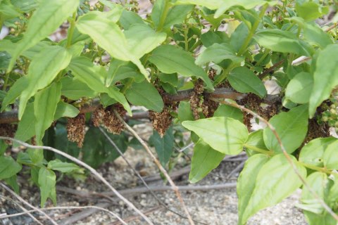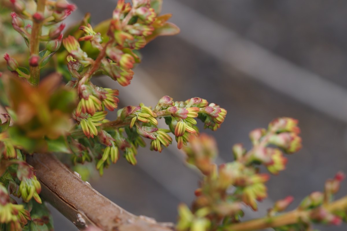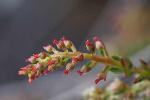 枝の脇から花序を出し、花弁が1mmしかなく雄しべや雌しべが突き出た多数の花を4~5月に咲かせます。