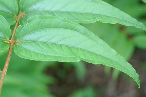 葉は長さ6~16cmの細長い楕円形で先にいくほど細くなり、葉柄がほとんどなく全縁です。