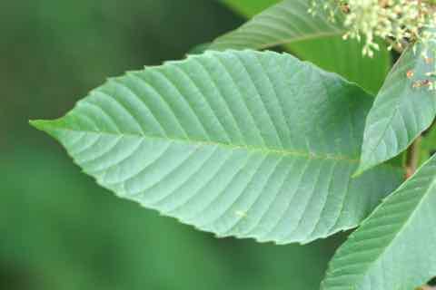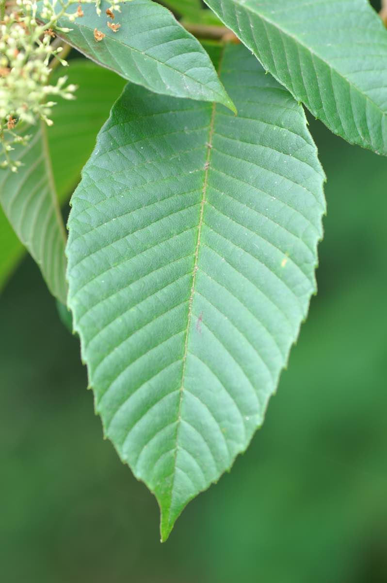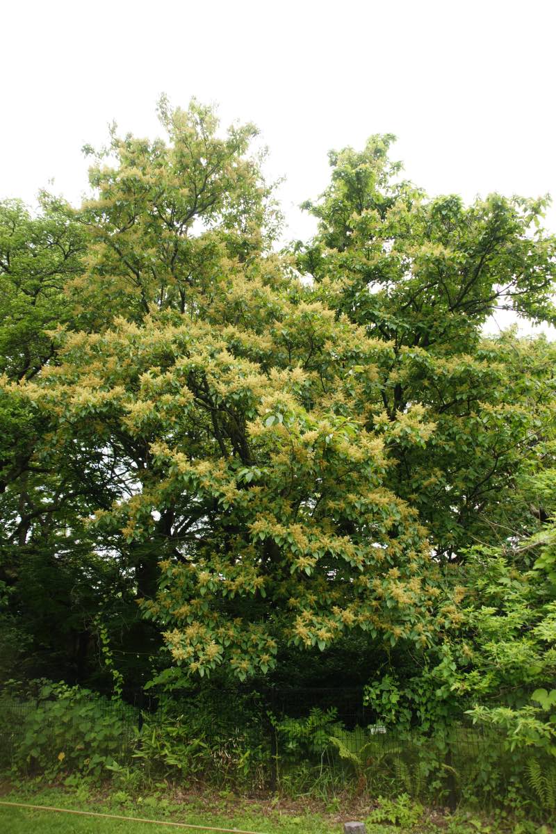 山地の林内や雑木林に生えています。樹高は10m程度で、樹皮は灰黒色です。葉はかなり大きくて、長さ8〜25cmの楕円形で、20〜30対の側脈が縁に向かって平行して並んでいるのが特徴です。6〜7月、枝の先に白い小さな花が円錐形に集まって咲きます。[1][2][3]