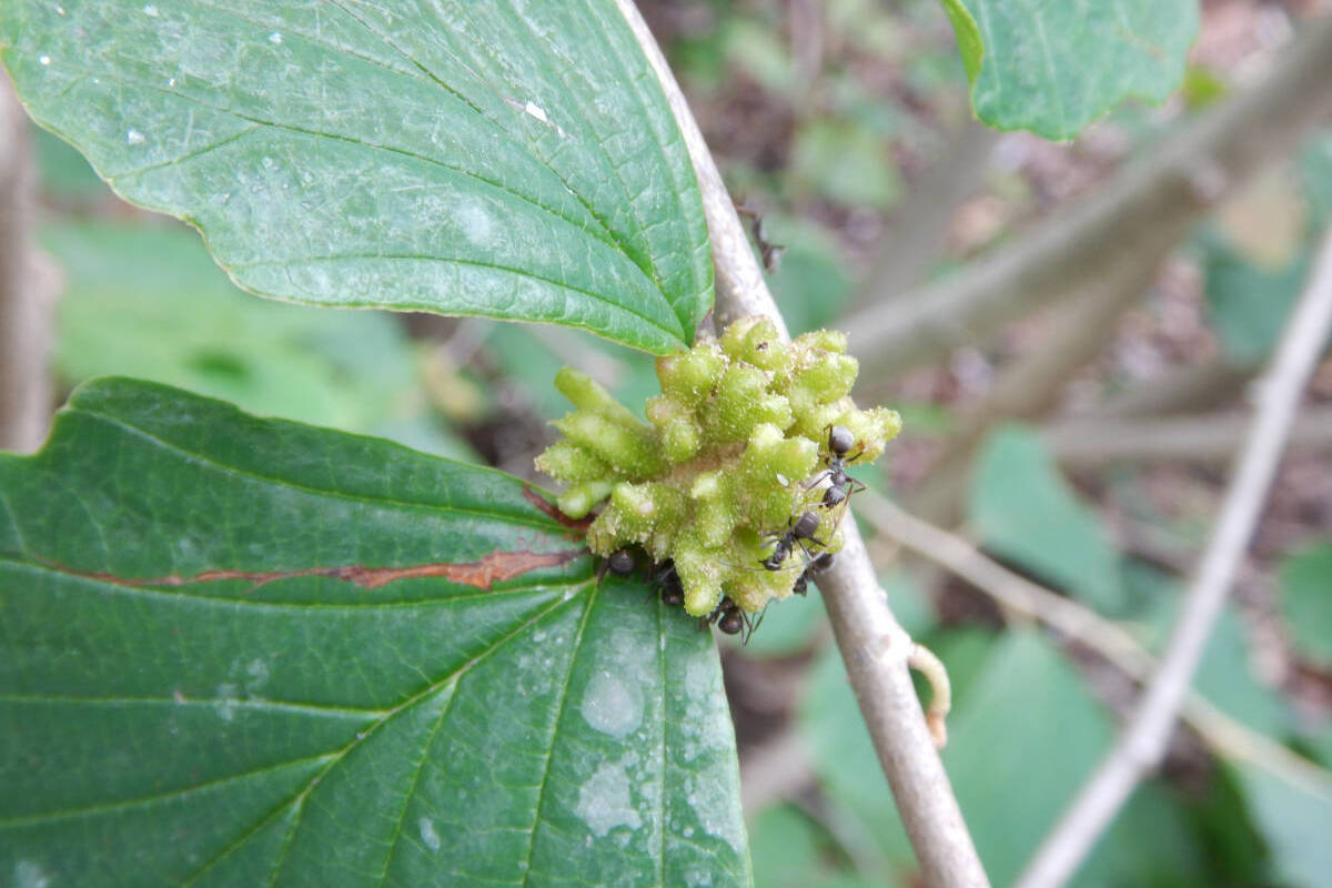 マンサクの葉柄の根本に突起状のかたまりを見かけることがあります。その突起がイガ状で鋭いものはマンサクメイガフシ、イボ状で先端が鈍いものはマンサクメイボフシと呼ばれる虫えいです。前者はマンサクイガフシアブラムシ(Hamamelistes miyabei)、後者がマンサクイボフシアプラムシ(Hamamelistes kagamii)というアブラムシによるものです。他にサンゴ状に分岐した突起があるフシを作るアブラムシがマンサクサンゴフシアブラムシ(Hamamelistes betulinus)と呼ばれます。これら3種はいずれもアブラムシ科ヒラタアブラムシ亜科Hamamelistes属で、属名が"Hamamelistes"とされている通りマンサクの腋芽に一次宿主として虫こぶを形成すること。また二次宿主としてそれぞれ順にウダイカンバ(Betula maximowicziana)のみ、ミズメ(Betula grossa)のみ、主にシラカンバ(Betula platyphylla)を利用しているそうです。遺伝子解析の結果、これら3種のアブラムシは200〜600万年ほど前に分化したと見られること、マンサクの地理分化と対応していることが確認されました。[4][5]